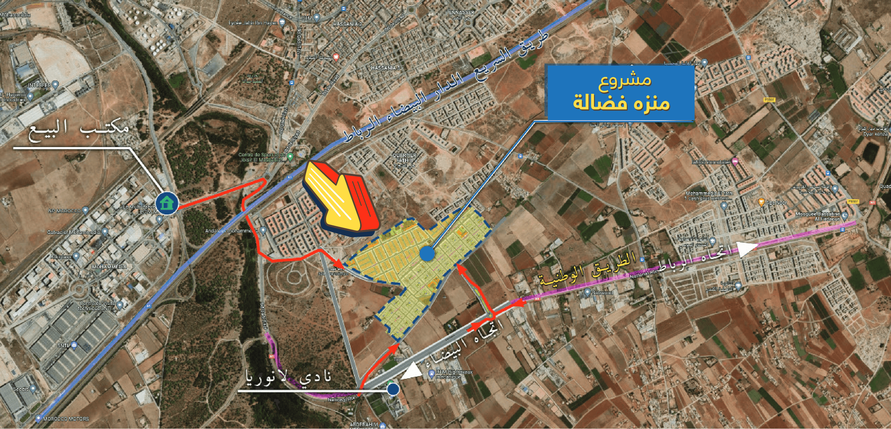 دقيقة من الدار البيضاء و 10 دقائق من المحمدية مع مدخلين من الطريق السيار ومن الطريق الوطنية الرابطة بين الرباط و الدارالبيضاء. يمنحكم هذا المشروع فضاء عيش مثالي كتحلى فيه الحياة أكثر.